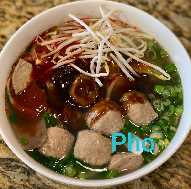 Thin slices beef and meatball in broth, garnished with green onions and cilantro